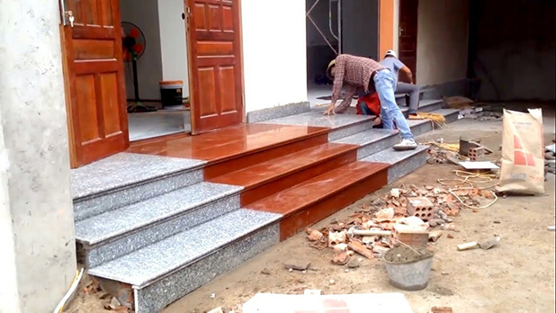 - Đặt tấm đá lên bề mặt lớp keo vừa rải, lấy búa cao su đóng nhẹ xuống và điều chỉnh lại độ cao của đá, độ đặc và chắc của keo.